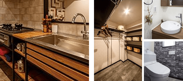 風合いのあるタイル、モルタル、無垢材、アイアンなど、テクスチャーの異なる様々な素材をミックスする事で、ヴィンテージ感溢れる住まいに。
