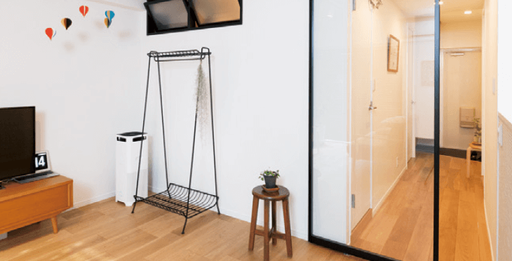 窓がなく暗かったLDKをバルコニーに移すことで、通風と採光に優れた住まいが実現しました。さらにLDKの入り口扉を素通しガラスを入れた吊り引き戸にすることで、玄関まで光が届く開放感も生まれました。床材にはオーク色の無垢材フローリングを使用し、白い壁とドアや窓の黒いフレームと併せて、お好みのインテリアに合うナチュラルな雰囲気づくりをしました。