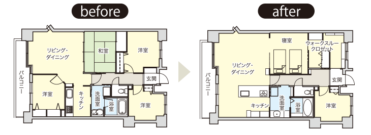 LDに接した洋室を無くし、半独立型キッチンをオープンカウンターにすることで、広々としたLDKが実現しました。またLDと寝室の間を部分的なスリット格子で仕切ることで、さらなる開放的な空間に生まれ変わりました。収納面に関しては、玄関横の洋室のサイズを縮小し、玄関と寝室へつながる2WAYのウォークスルークローゼットに変更して、土足で上がれる靴箱を設けました。