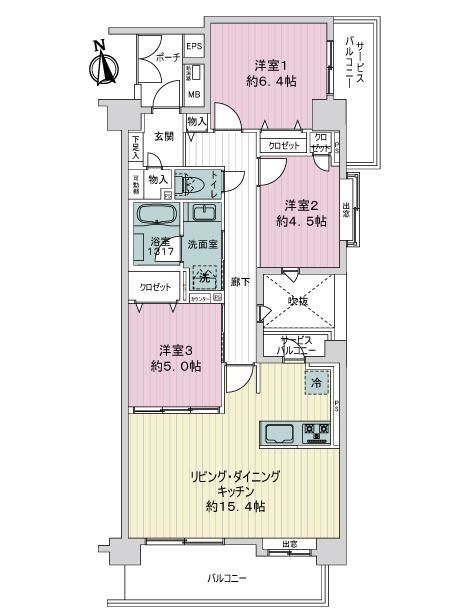 2面に窓を設けた洋室、勝手口のように使えるサービスバルコニーがあり、生活の質を高める工夫が施されております。