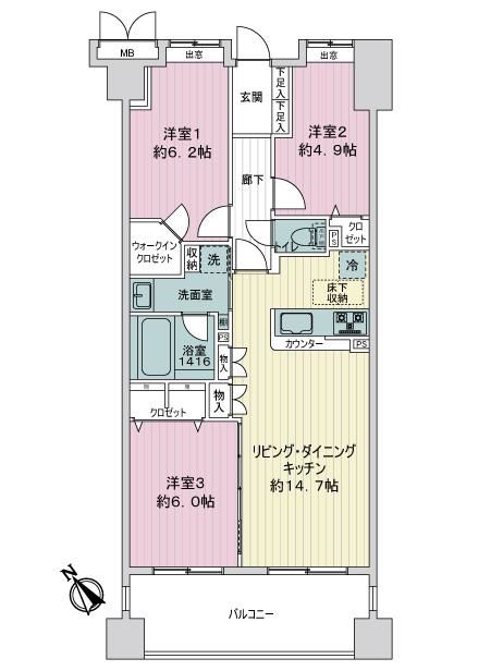 ・南西向きの3LDK、全居室フローリング