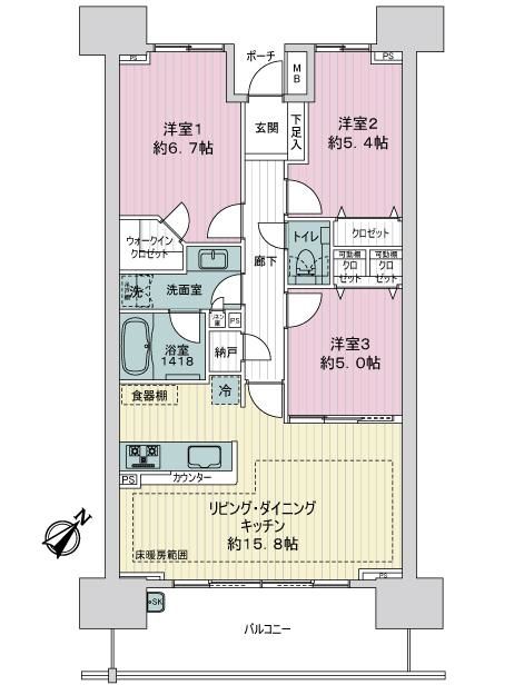 ・南東向きの3LDK、全居室フローリング