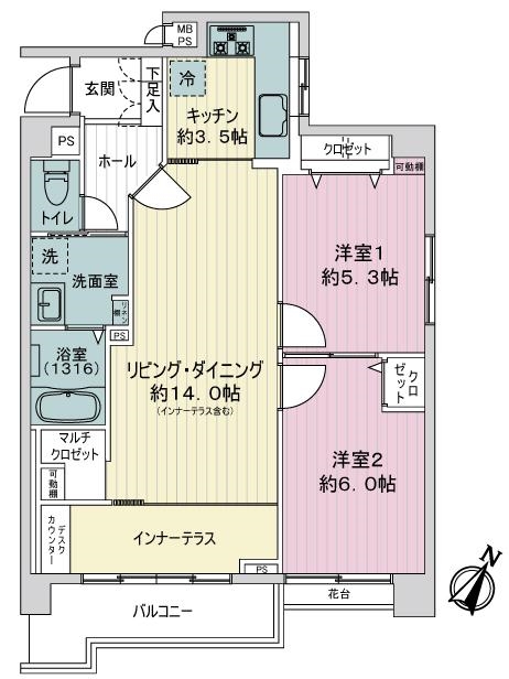 一部間取り変更を施し、インナーテラス、マルチクロゼット、デスクカウンターを設置。