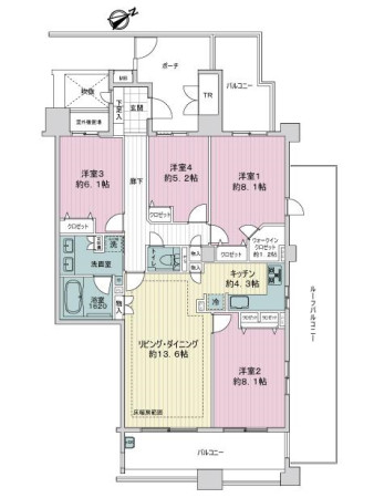 お部屋は、南東、北東、北西の角住戸。ゆとりの広さ103.93平米4LDK。通風良好