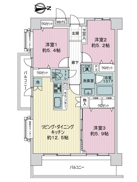 約65平米×3LDK×東・南角住戸