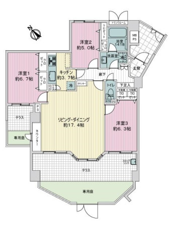 ・戸建て感覚の専用ポーチ(約5.14平米)とトランクルーム(専有面積に含む)がございます。